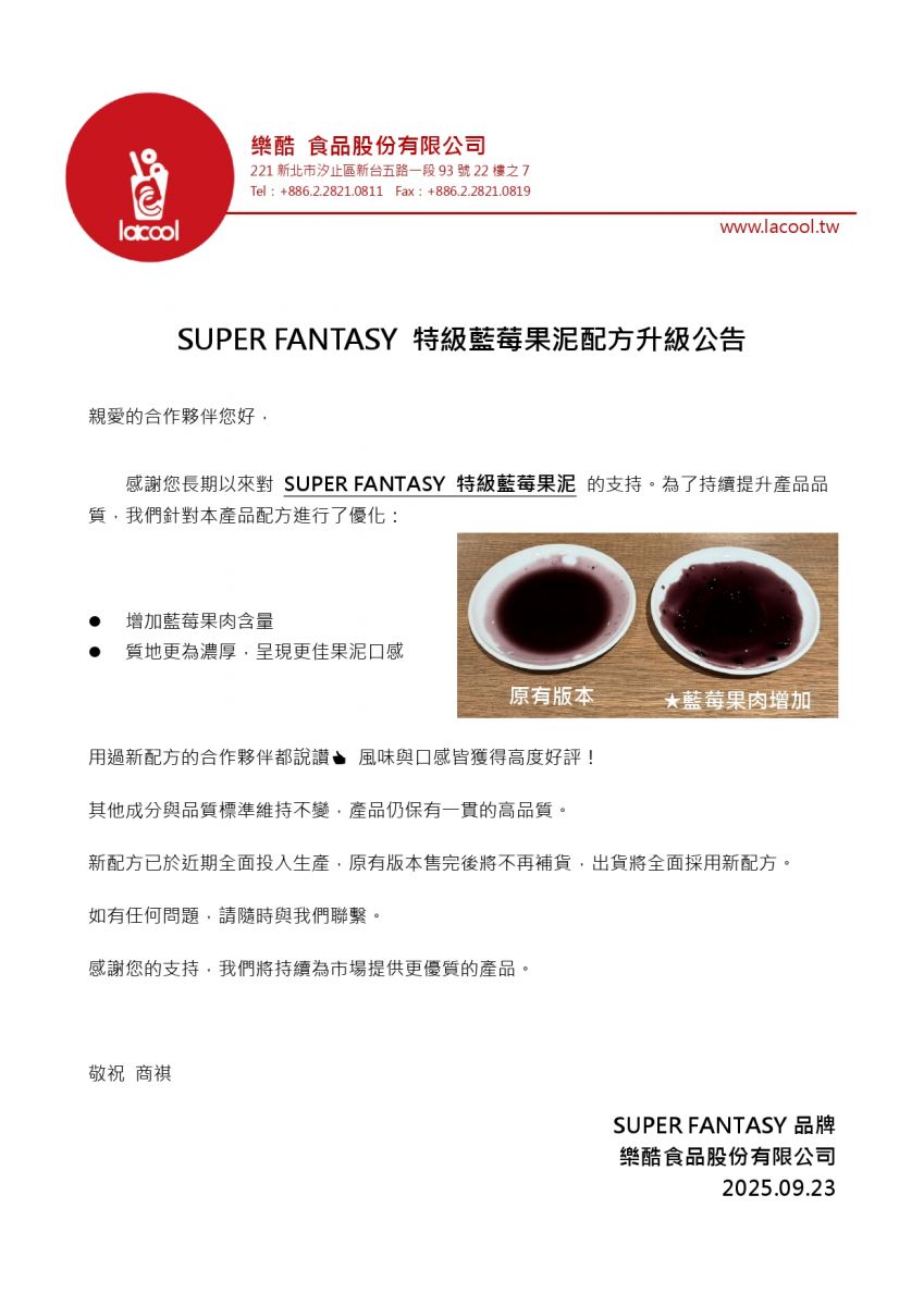 SUPER FANTASY 特級藍莓果泥配方升級公告